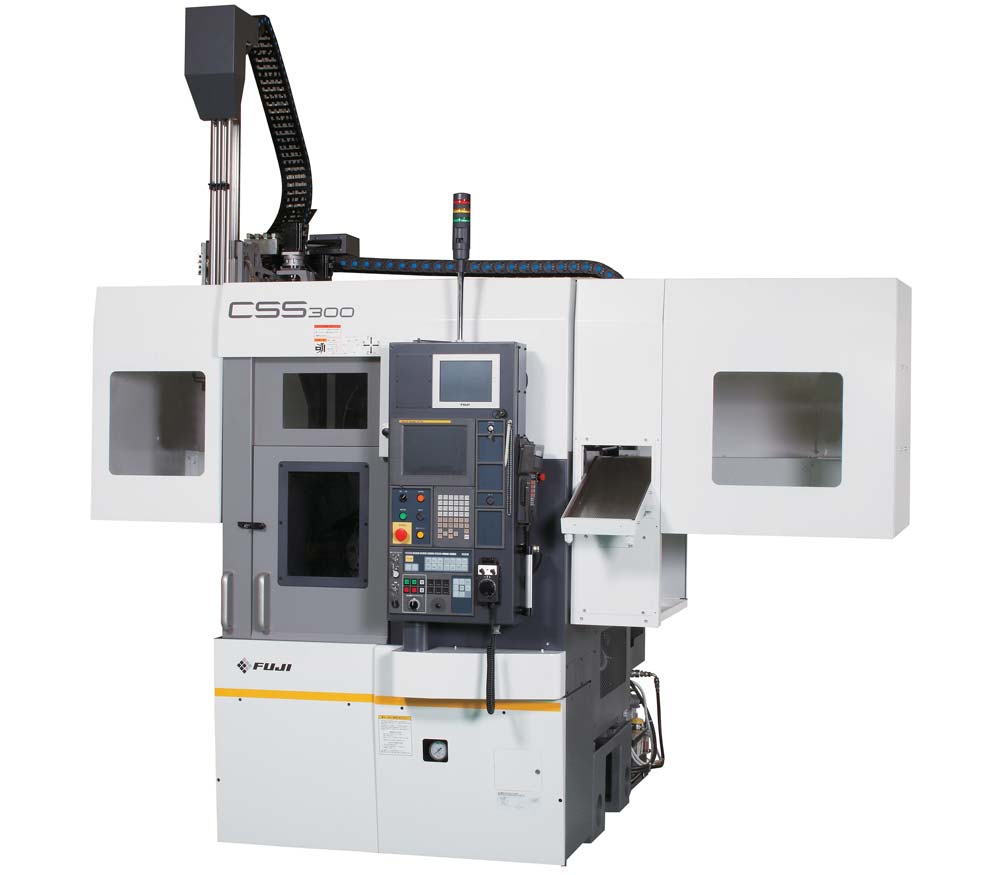 The CSS-300 Single Spindle Lathe is a front facing modular machine with 1 spindle, 1 turret and a gantry robot.