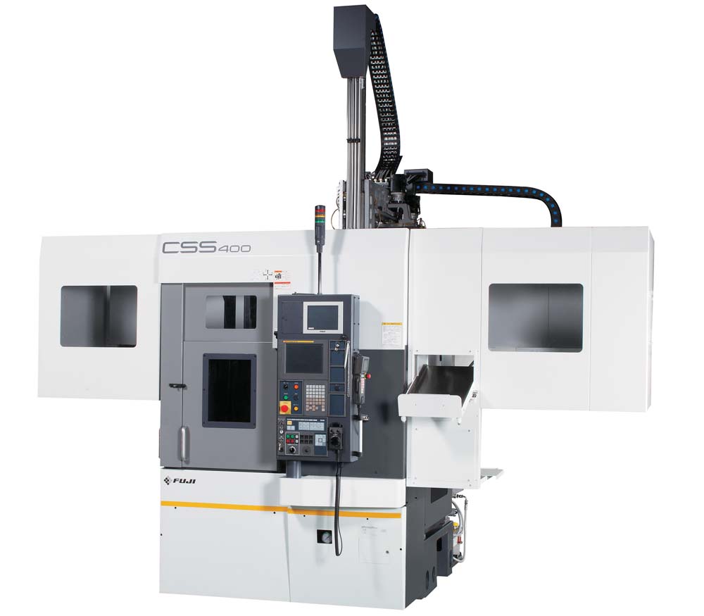 The CSS-400 Single Spindle Lathe is a front facing modular machine with 1 spindle, 1 turret and a gantry robot.